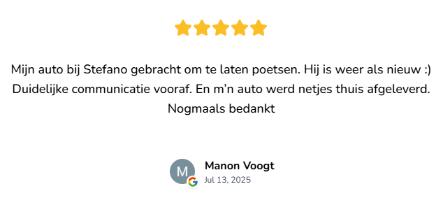 Bij Nicolas Auto Detailing begrijpen we dat uw auto meer is dan alleen een vervoermiddel. Onze gespecialiseerde diensten, waaronder interieur- en exterieur schoonmaak, waxen, glass coating en polijsten, zorgen ervoor dat uw voertuig er altijd op zijn best uitziet. Laat ons de zorg voor uw auto op ons nemen, zodat u kunt genieten van een stralende en goed onderhouden wagen.